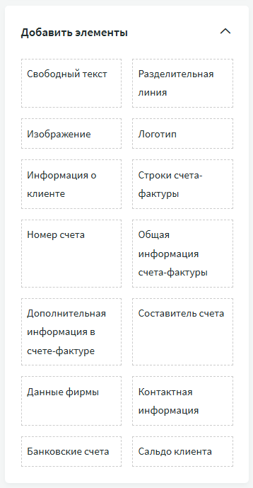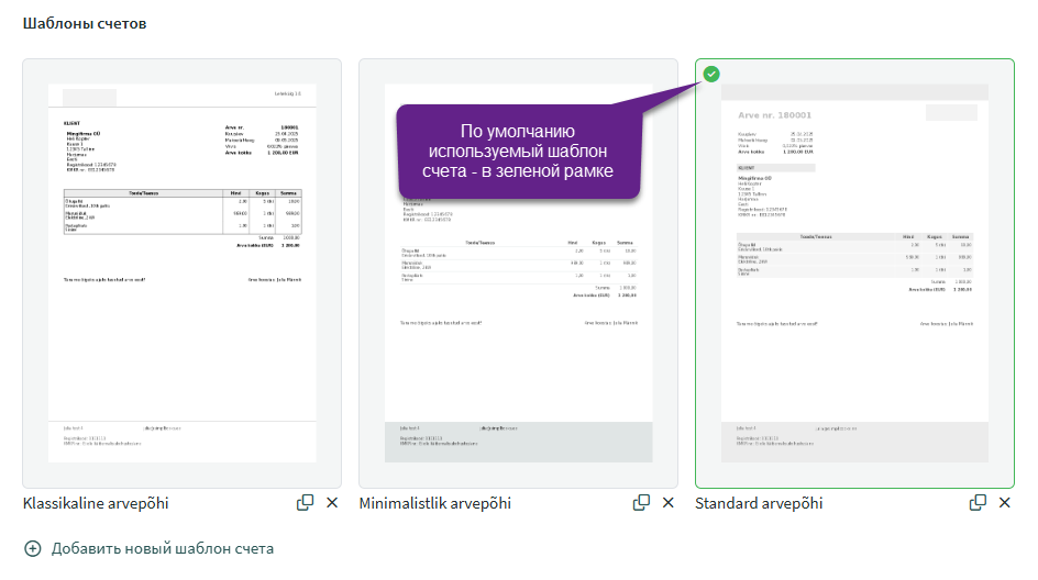 По умолчанию доступны 3 шаблона счета продажи, которые можно сразу использовать при отправке счетов. Преднастроенные шаблоны нельзя удалить или изменить. При желании вы можете на их основе создать подходящий вам дизайн счета продажи. Также можно создать совершенно новый документ и самостоятельно добавить нужные элементы.