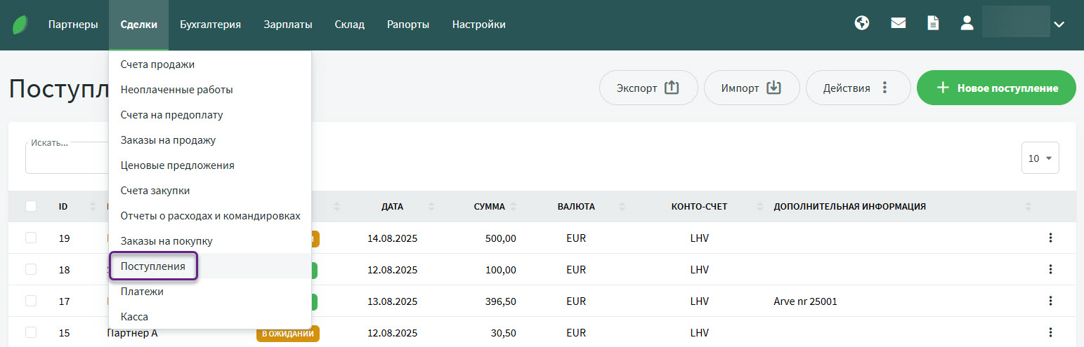 Поступления можно найти в разделе «Сделки -> Поступления».