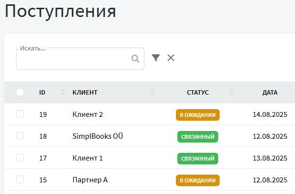 Статус поступления «Связанный» (на зеленом фоне) означает, что поступление полностью связано с одним или несколькими счетами продажи.