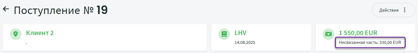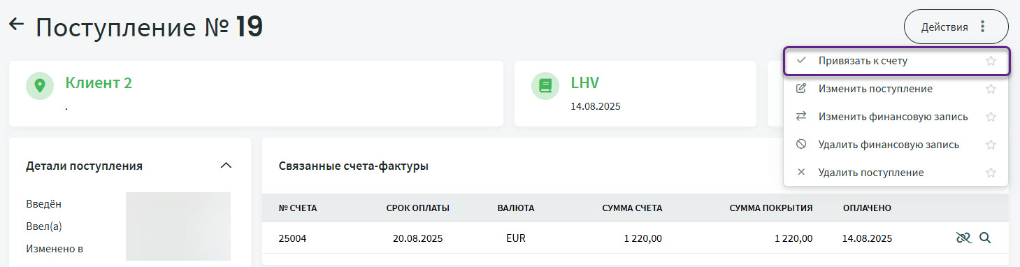 Чтобы связать поступление с неоплаченным счетом, нажмите кнопку «Действия» и выберите пункт «Привязать к счету».
