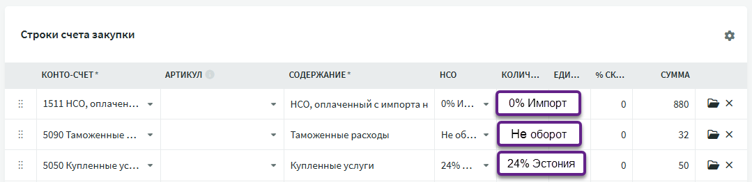 При вводе счета закупки на импортированный товар используйте в строке расходов вид НСО «0% Импорт».