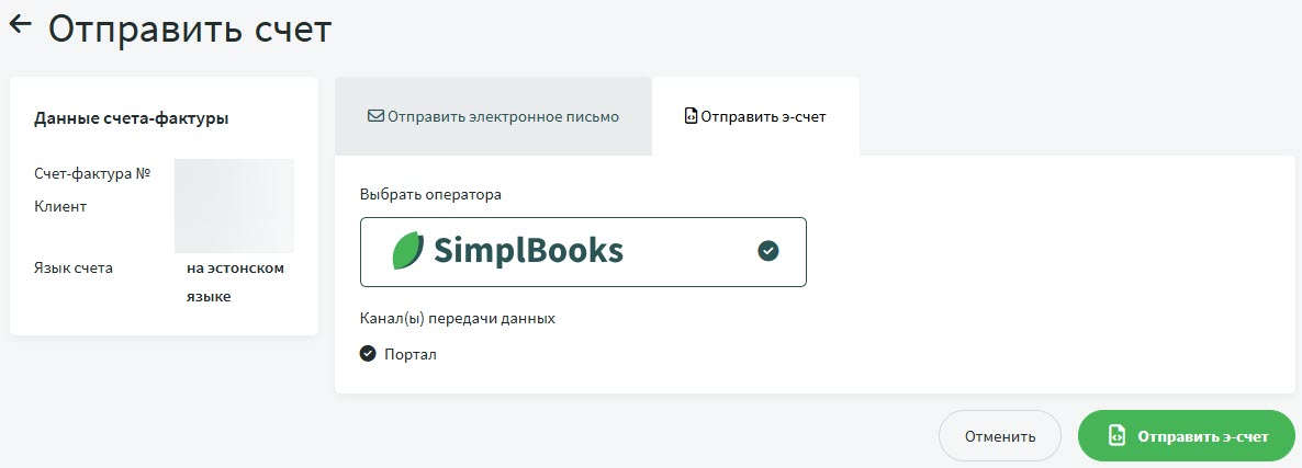 Если компании необходимо отправлять электронные счета, но не получать их, это можно сделать напрямую из SimplBooks, без заключения договора с оператором электронных счетов. Таким образом, можно отправлять э-счета эстонским компаниям и государственным учреждениям. Чтобы отправлять э-счета в сеть PEPPOL, нужно добавить интеграцию (Finbite, Banqup).