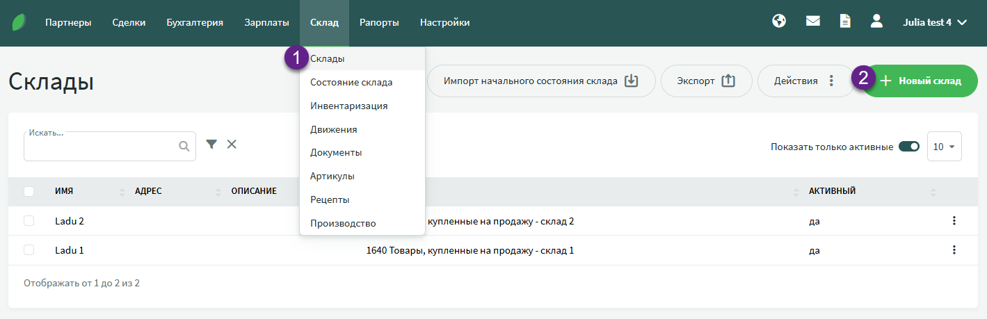 Если вы добавляете новый финансовый конто-счет для склада, его необходимо также добавить в раздел складов: Склад -> Склады (1) -> Новый склад (2).