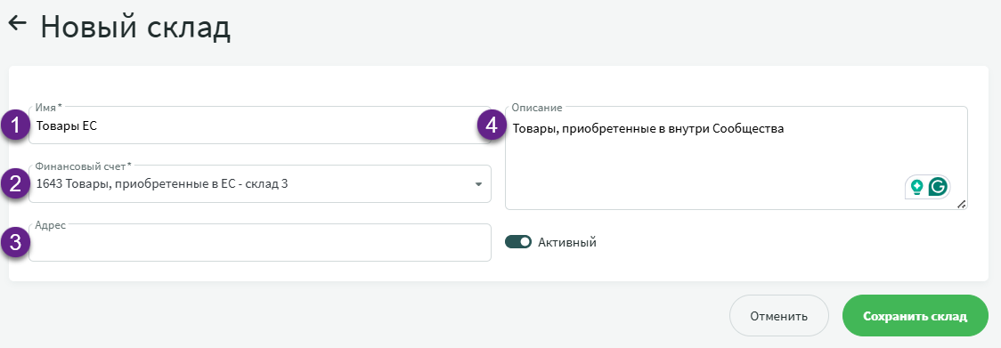 - Описание – отображается в списке складов; дополнительная информация, заполнять необязательно.