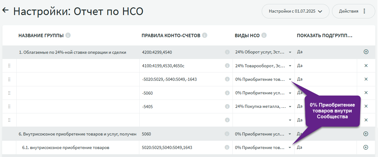 Для строки 1 «0% Приобретение товаров внутри Сообщества» добавьте к виду НСО в правилах конто-счетов нужный складской счет (например, «1643 Товары, приобретенные в ЕС — склад 3»). Отделите этот конто-счет от других счетов запятой, пробел не ставьте, перед номером конто-счета обязательно поставьте минус.