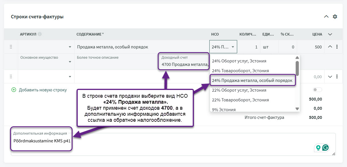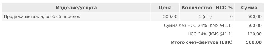 При продаже металлических изделий, перечисленных в , в счете продажи необходимо использовать вид НСО «24% Продажа металла, особый порядок», для которого в качестве счета доходов должен быть настроен счет «4700 Продажа металла, особый порядок (ст. 41 прим. 1 ЗНС)».