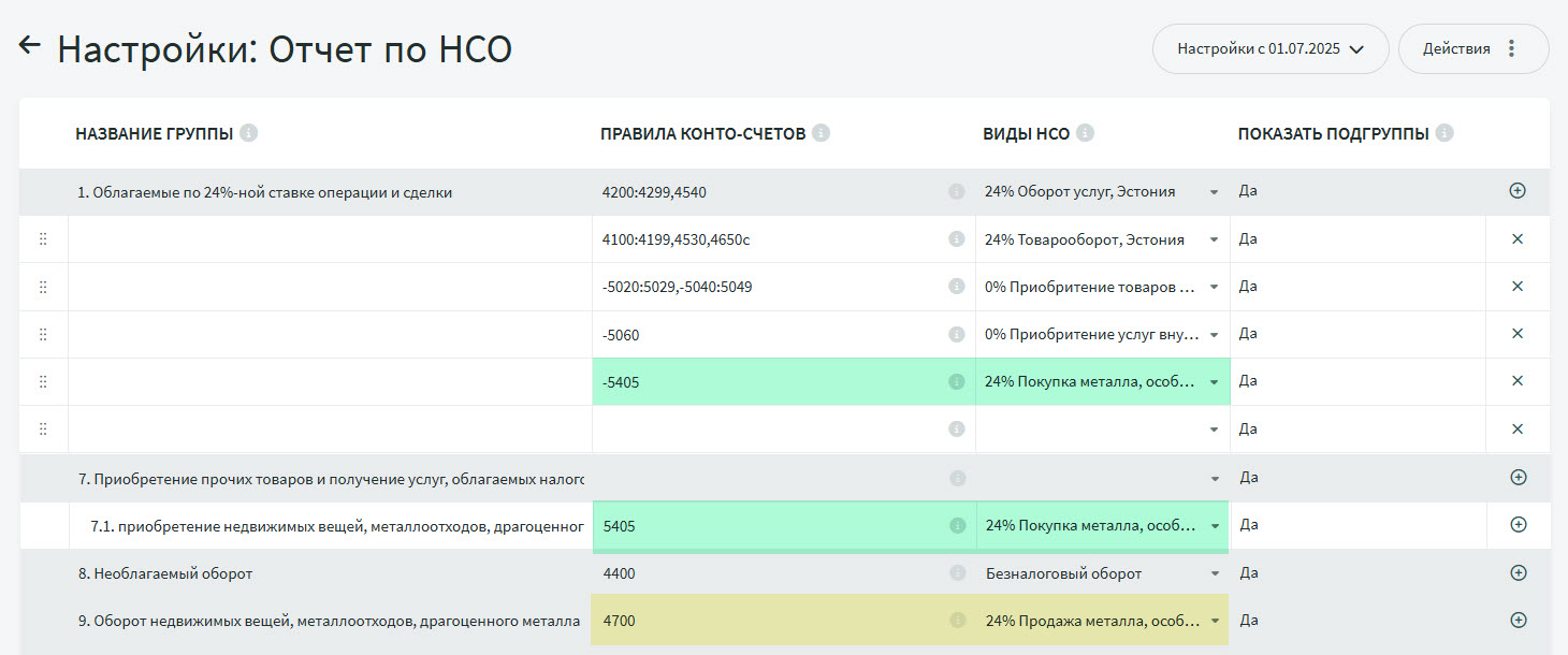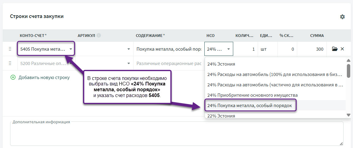 ● Для отражения покупки металлических изделий создан счет расходов «5405 Покупка металла, особый порядок (ст. 41 прим. 1 ЗНС) (обратное налогооблажение)». Также в счете закупки необходимо использовать вид НСО «24% Покупка металла, особый порядок».Поскольку данные в отчете по НСО формируются на основании конто-счета + вида НСО, при покупке металлов можно использовать и другие конто-счета расходов. В таком случае необходимый конто-счет расходов нужно самостоятельно добавить в настройки отчета.