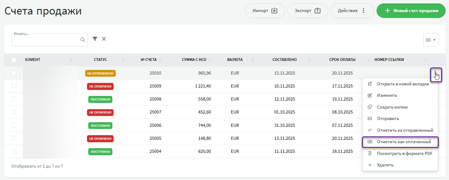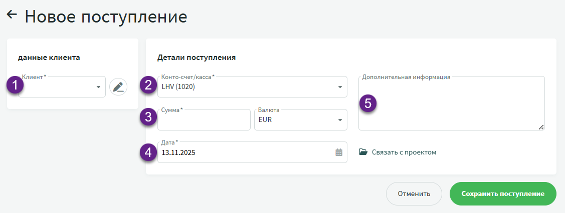 Для добавления поступлений есть два варианта: начать со счета продажи или через меню «Сделки -> Поступления».