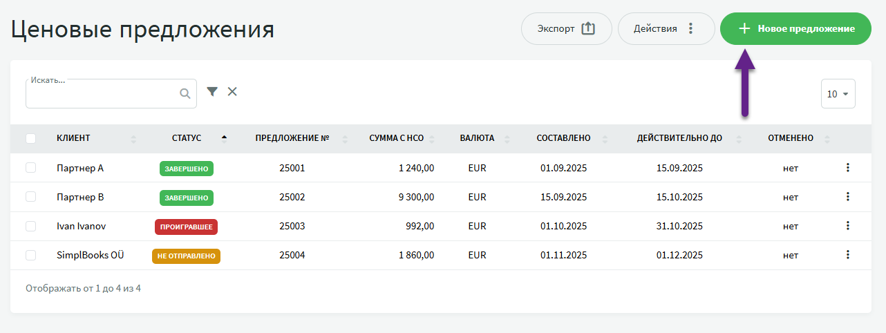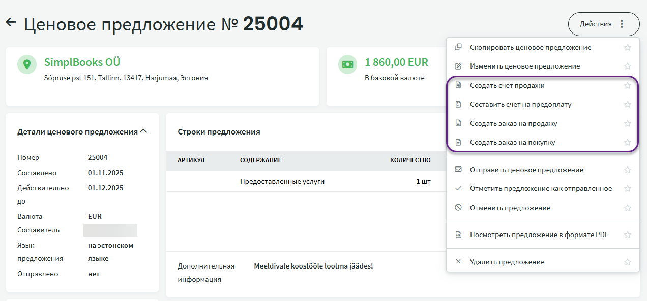 ● Следующий документ на основании предложения можно сформировать через кнопку «Действия». ● Из одного ценового предложения можно составить только один счет или один заказ.При возникновении дополнительных вопросов напишите нам по адресу support@simplbooks.ee