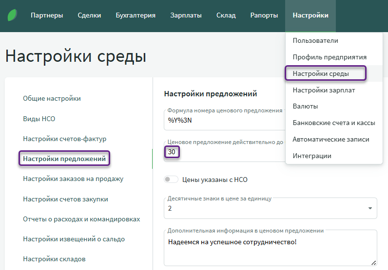 Предложения позволяют быстро и просто составлять и отправлять клиентам корректно оформленные ценовые предложения. Система позволяет отслеживать статус предложения и в пару кликов преобразовать его в следующий подходящий документ (заказ на продажу, заказ на покупку, счет на предоплату, счет продажи). Строки предложения идентичны строкам счета продажи, но финансовые записи не формируются, поэтому на бухгалтерский учет они не влияют. При добавлении складских артикулов в предложение складской остаток не проверяется, и добавленные артикулы не бронируют товар.