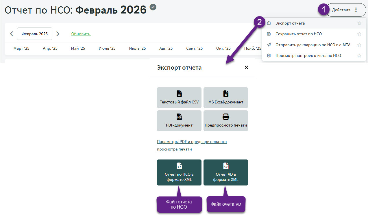 В открывшемся окне выберите одну из темных кнопок внизу — «Отчет по НСО в формате XML», сохраните файл на компьютер, после чего его можно импортировать в e-MTA.