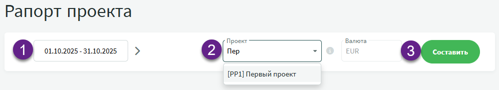 ● Для формирования отчета необходимо выбрать период и проект.Проекты, добавленные напрямую к финансовым записям, не включаются в рапорт по проектам. Они попадут в бухгалтерские отчеты, составленные на основе записей: баланс, отчет о прибыли, главная книга, дневная книга.
