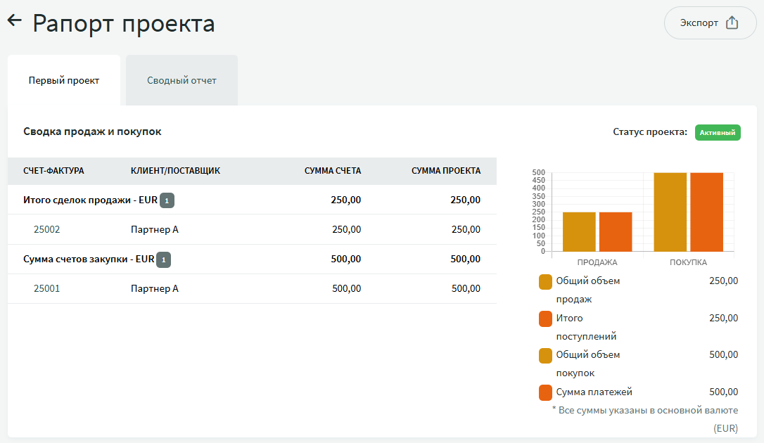 2. В сводном отчете учитываются все (в том числе неактивные) проекты, с которыми связаны счета закупки, счета продажи и начисления зарплаты.
