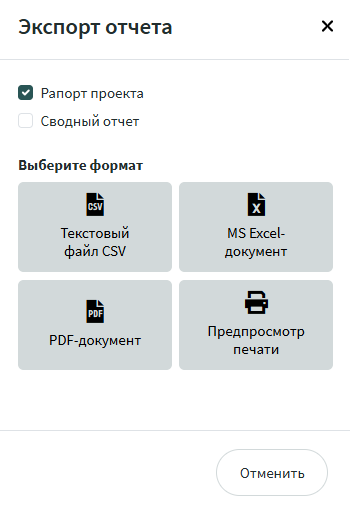 ● Рапорт можно сохранить, нажав кнопку «Экспорт».В открывшемся окне можно выбрать, какие отчеты экспортировать и в каком формате.