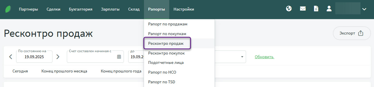 Для экспорта ресконтро продаж нажмите кнопку «Экспорт» (справа над отчетом).