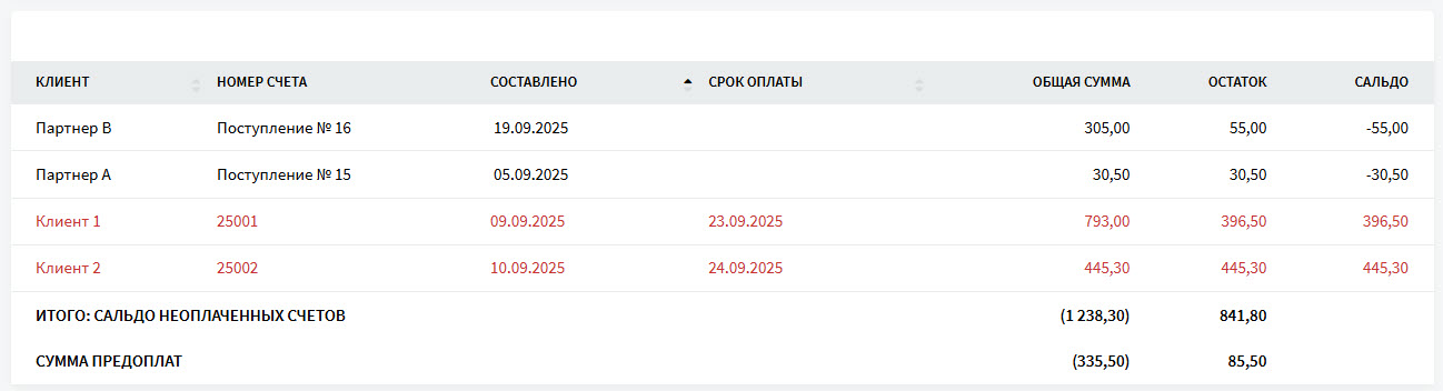 Если у клиента в колонке «Остаток» указана сумма со знаком минус, это означает, что у клиента есть предоплата.