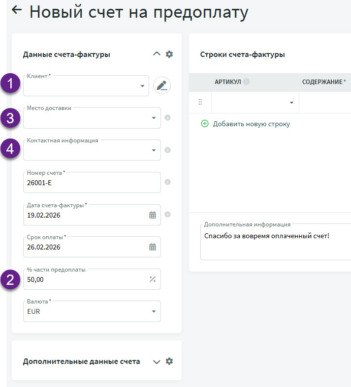 Счет на предоплату предназначен для случаев, когда от клиента требуется полная или частичная предоплата до поставки товара или оказания услуги.
