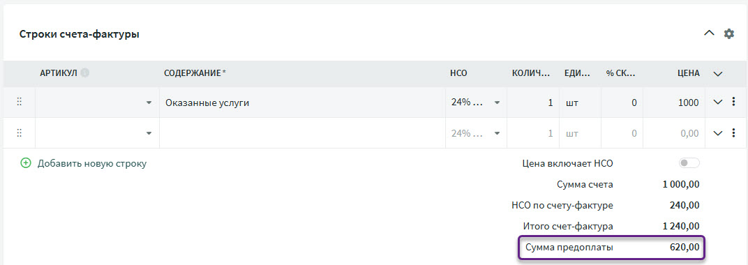 Заполнение строк счета на предоплату осуществляется аналогично заполнению строк счета продажи. Подробнее об этом можно прочитать в инструкции «Составление счета продажи».