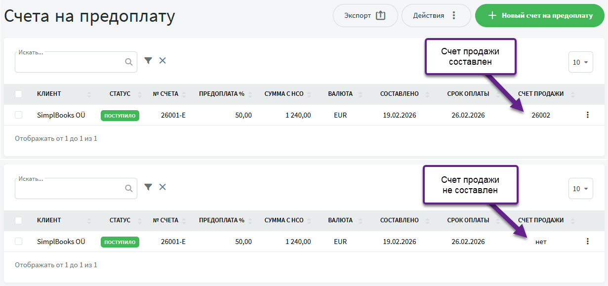 Если по счету предоплаты счет продажи еще не создан, в этой колонке отображается текст «нет», если создан — отображается номер счета.