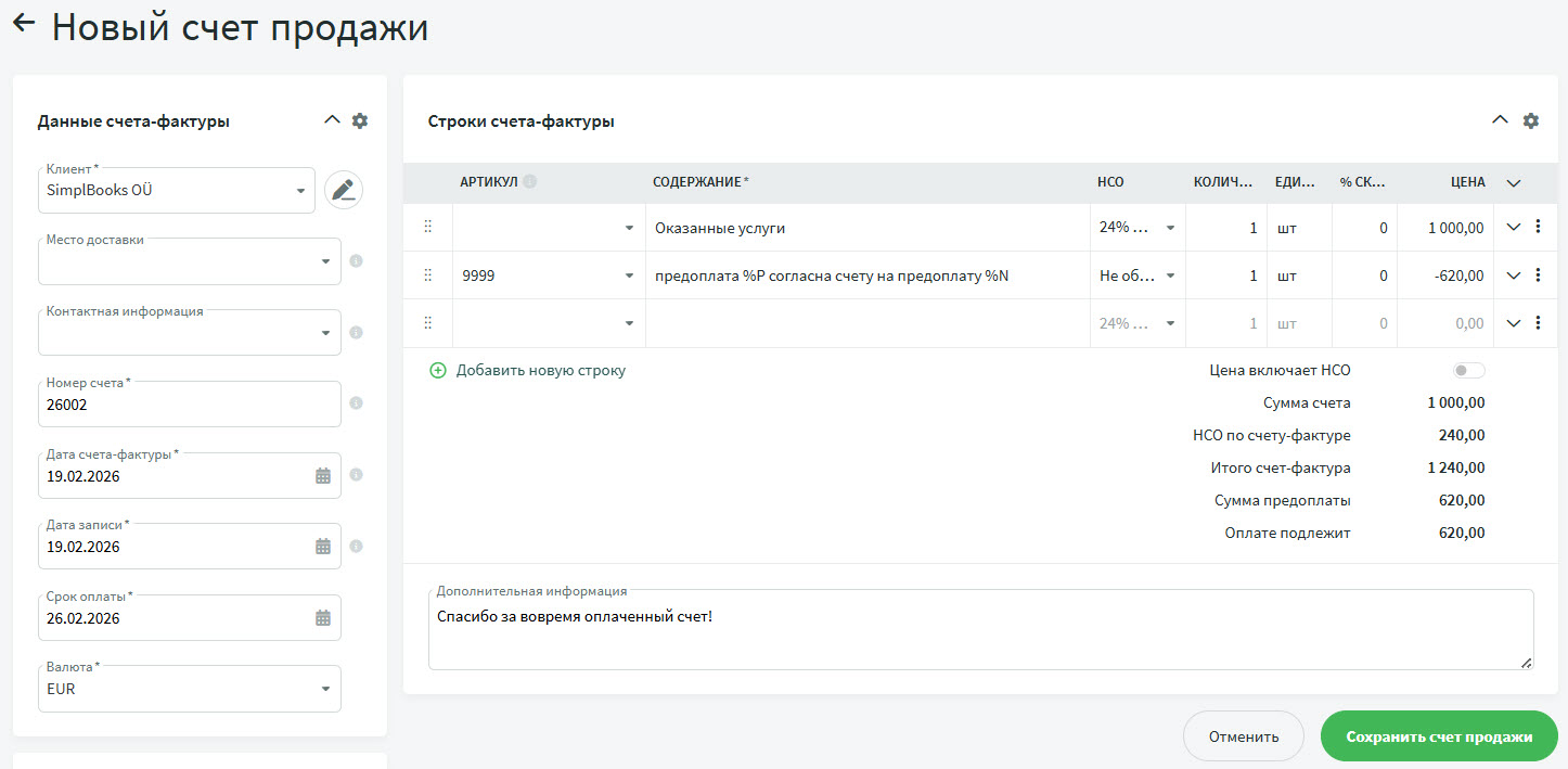 Предупреждение Не используйте в счетах (в том числе в счетах на предоплату) системный артикул «9999 Предоплата %P согласно счету предоплаты %N». Этот артикул система использует при создании счета продажи на основании счета предоплаты.Если добавить его в счет вручную, выручка от продажи будет отражена некорректно, а в отчете по НСО данные будут отображаться неправильно.