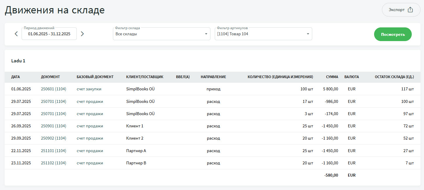 Перейдите в «Склад -> Движения», выберите нужный период и добавьте фильтр по артикулу