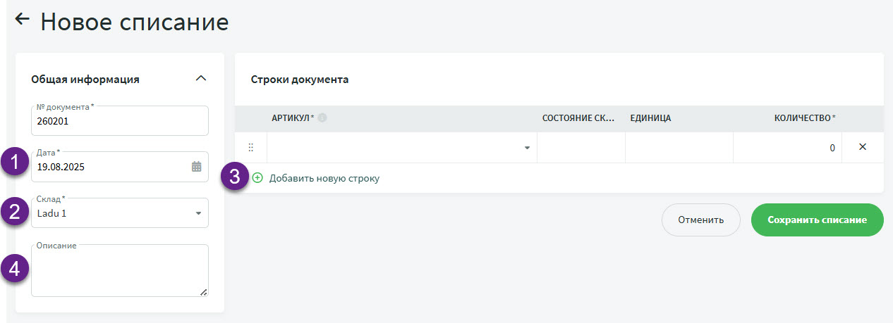 Склад -> Документы -> Новый документы -> Списание со складского учета