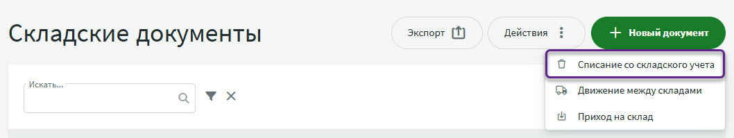 Склад -> Документы -> Новый документ -> Списание со складского учета