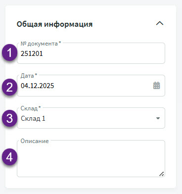 ● Панель общей информации- Номер документа – генерируется системой автоматически. Формулу нумерации складских записей можно настроить в разделе: Настройки -> Настройки среды -> Настройки складов.