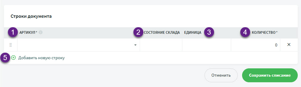 - Добавить новую строку – для добавления к списанию следующего артикула.