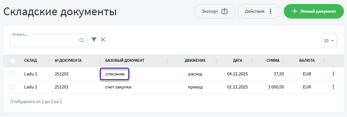 В открывшемся окне отображается форма документа списания складских артикулов.