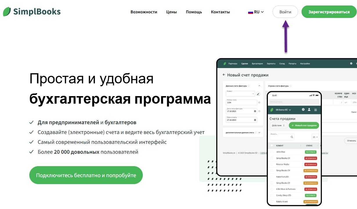 ● В свой аккаунт SimplBooks вы можете войти через главную страницу SimplBooks, нажав в правом верхнем углу на белую кнопку «Войти».