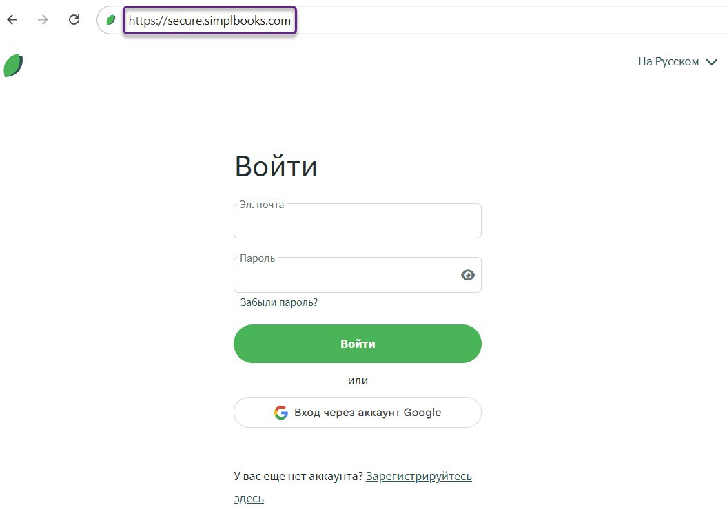 ● Нажав на кнопку «Войти», система перенаправит вас на адрес secure.simplbooks.com, который можно сохранить в закладки и использовать как прямую ссылку для входа.