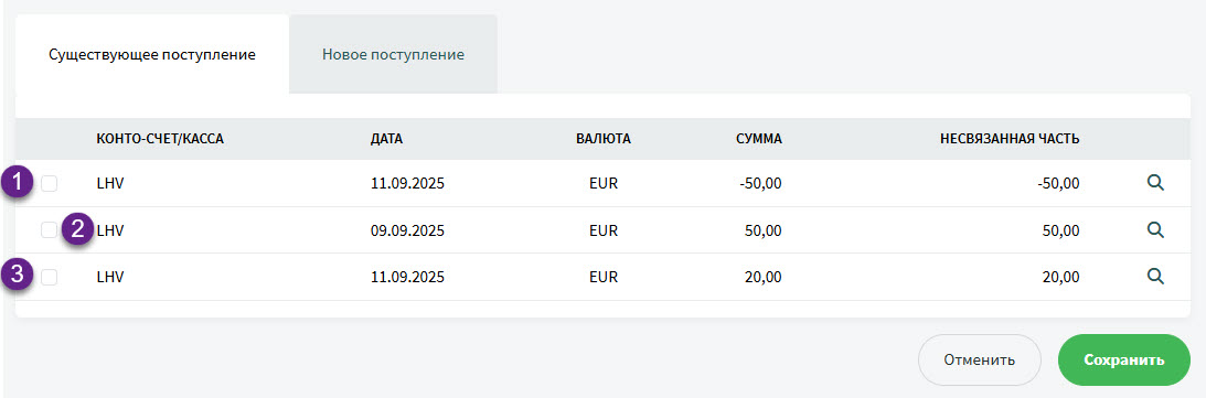 • Если вы осуществляете частичный возврат, то, как правило, выставляется счет на определенную сумму, и возврат также можно связать с этим счетом. Важно помнить, что в первую очередь необходимо связать возврат, то есть поступление со знаком минус.