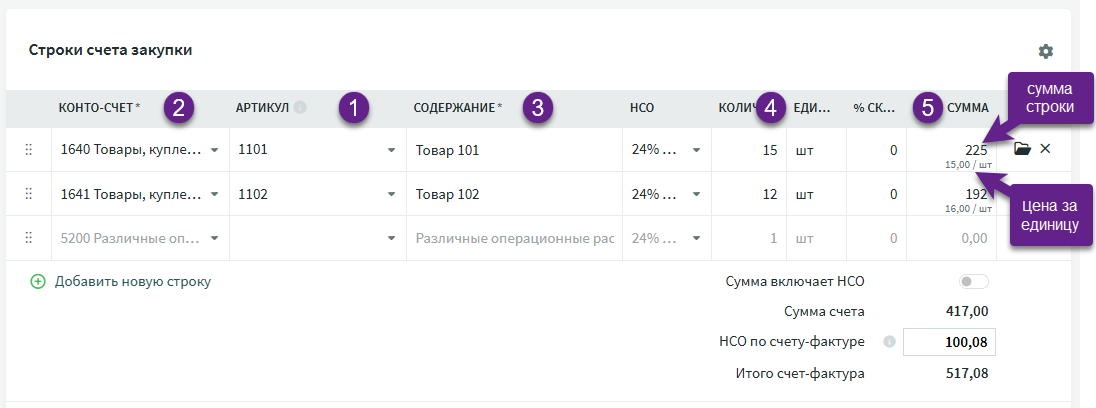Добавьте новый счет закупки и начните с заполнения данных о поставщике и общих сведений счета. В строках счета важно сначала выбрать артикул.