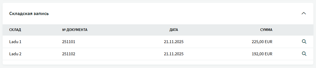 Когда все необходимые артикулы добавлены в счет закупки и счет сохраняется, система автоматически формирует приход на склад. Номер(а) документа поступления отображается на панели «Складская запись». В данном примере в счете закупки есть артикулы с разными складскими счетами, и соответственно поступления идут на разные склады.