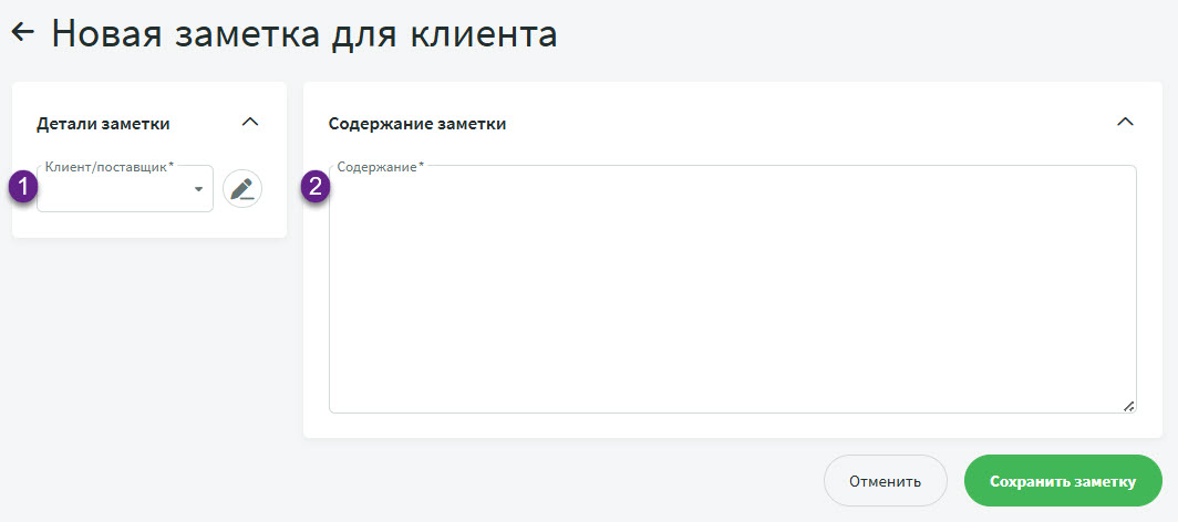 Заметки можно добавлять вручную, чтобы лучше управлять информацией, связанной с клиентом или поставщиком.