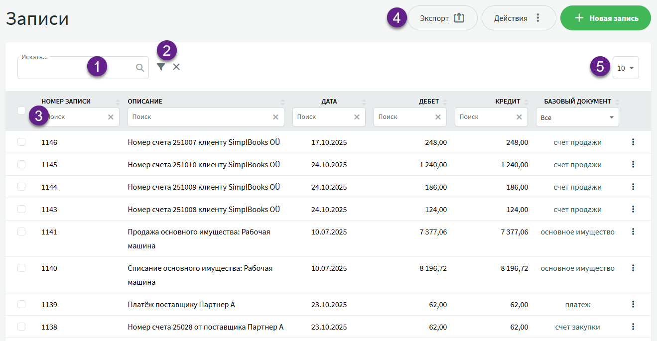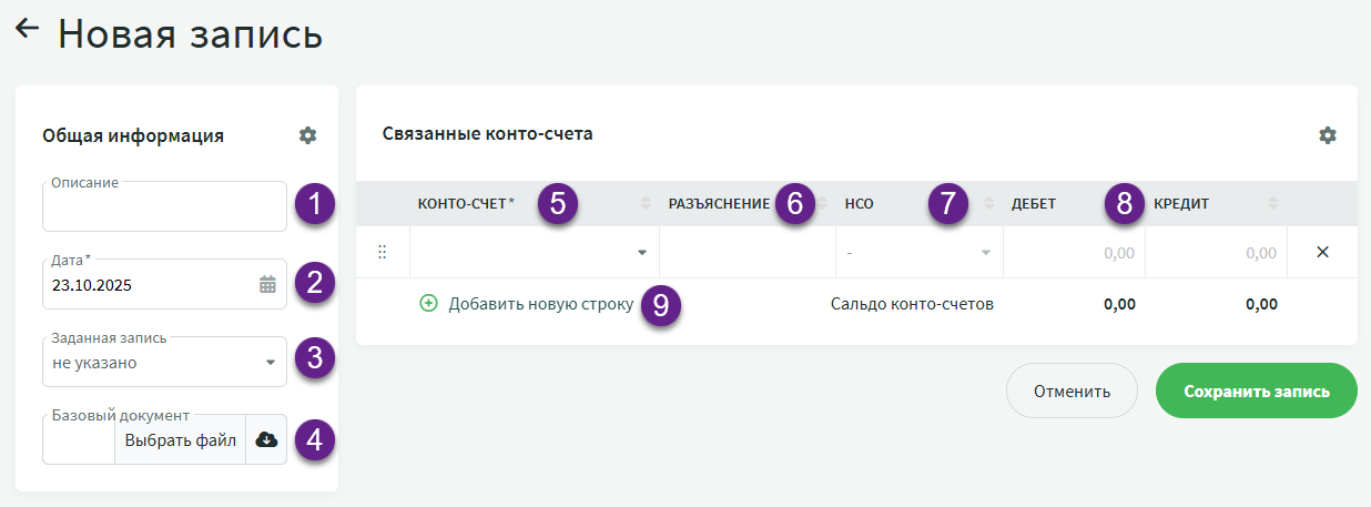 Бухгалтерия -> Записи -> Новая запись