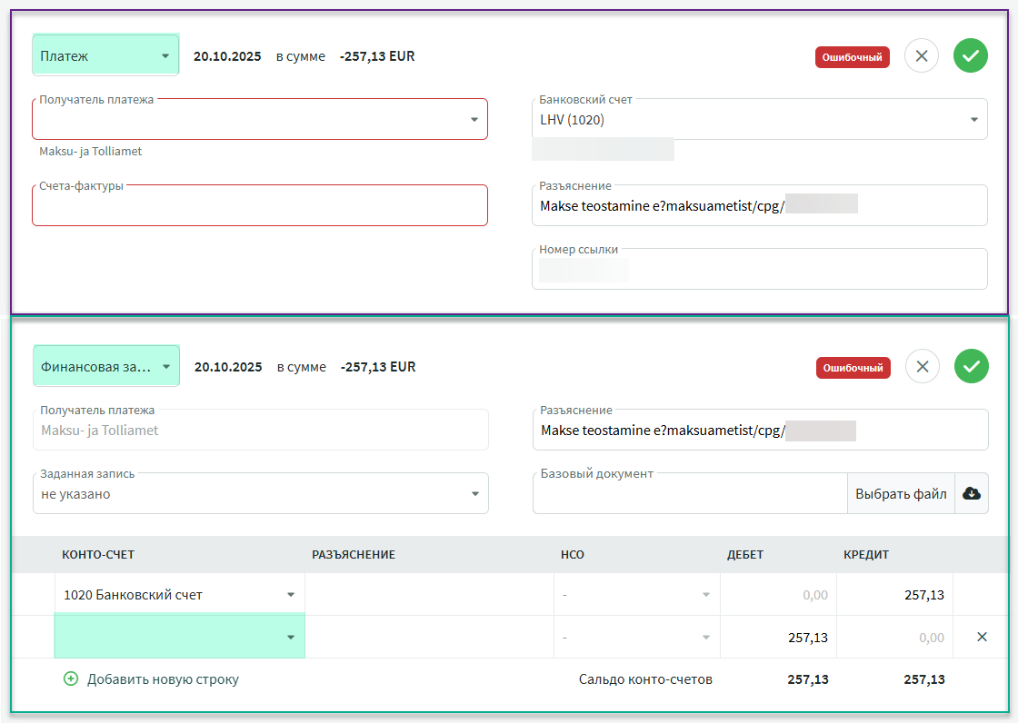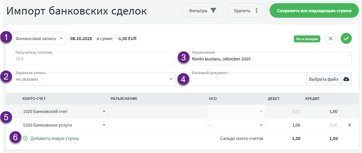 - Первая строка конто-счетов заполняется данными банковского счета, полученными из импорта; эту строку изменить нельзя.