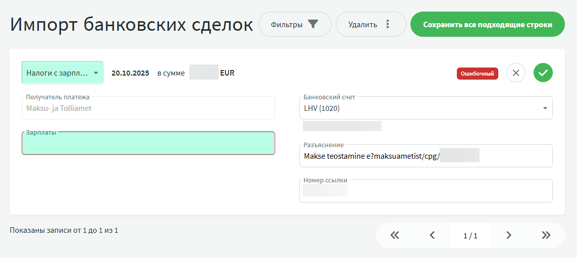 - Разъяснение заполняется автоматически информацией, полученной из банка (при использовании преднастроенной записи значение будет заменено пояснением из нее).