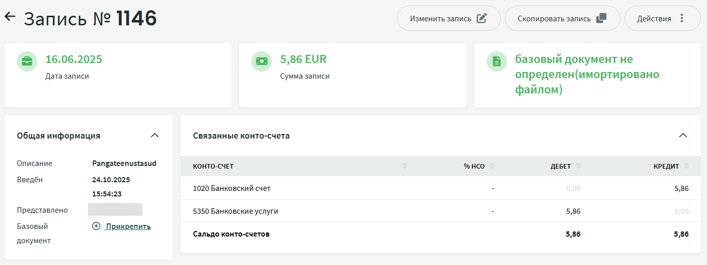 Запись по банковским услугам система, как правило, распознает автоматически и сразу предлагает подходящий конто-счет расхода: