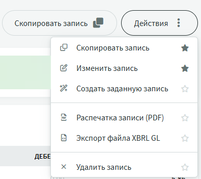 При наведении курсора на кнопку меню «Действия» отобразятся доступные варианты. Здесь также можно пометить как избранные два наиболее часто используемых вами действия.